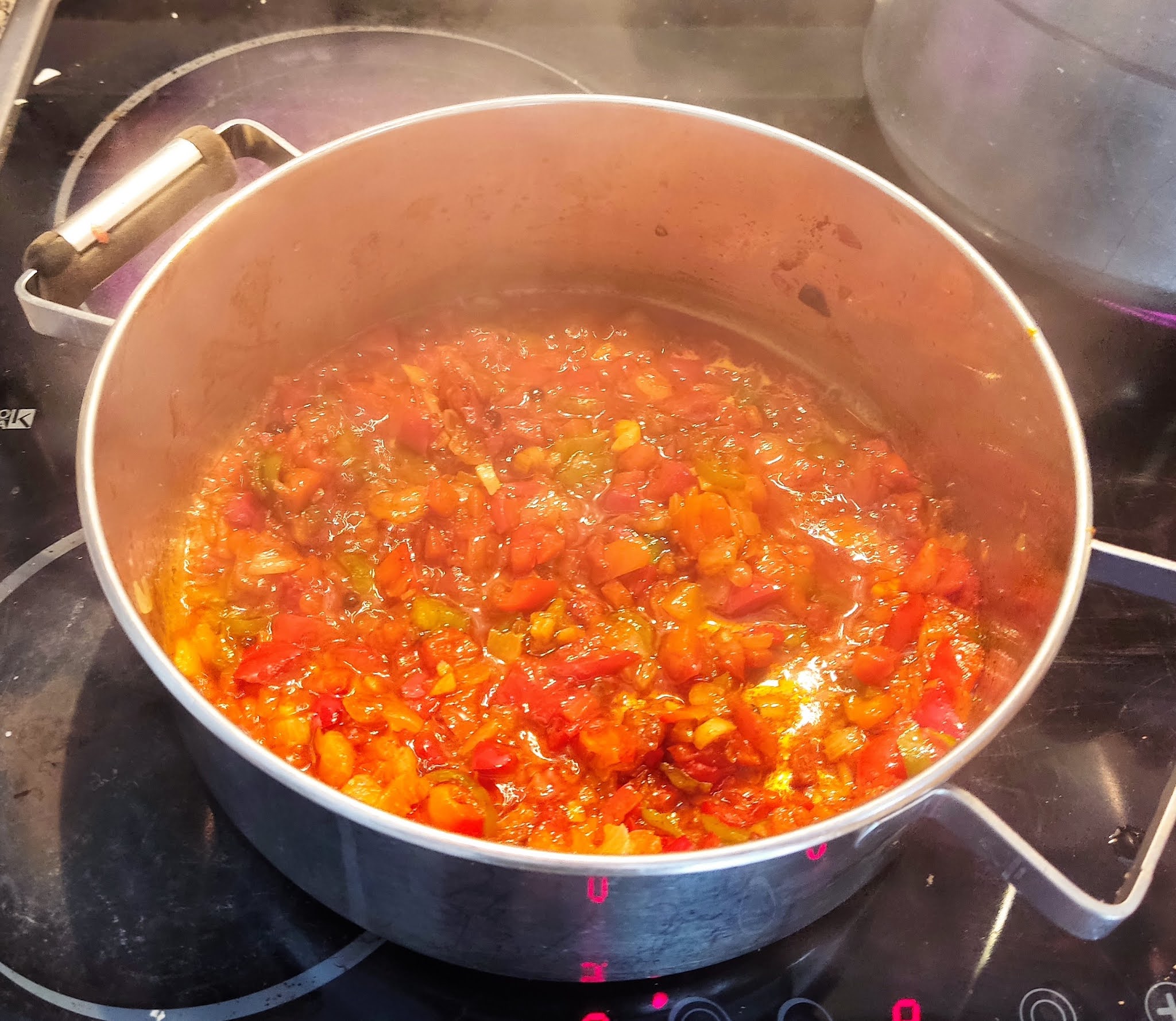 Cuando esté todo bien pochado, bajar el fuego y añadir el pimentón, procurando que no se queme. Si es necesario apartar del fuego.